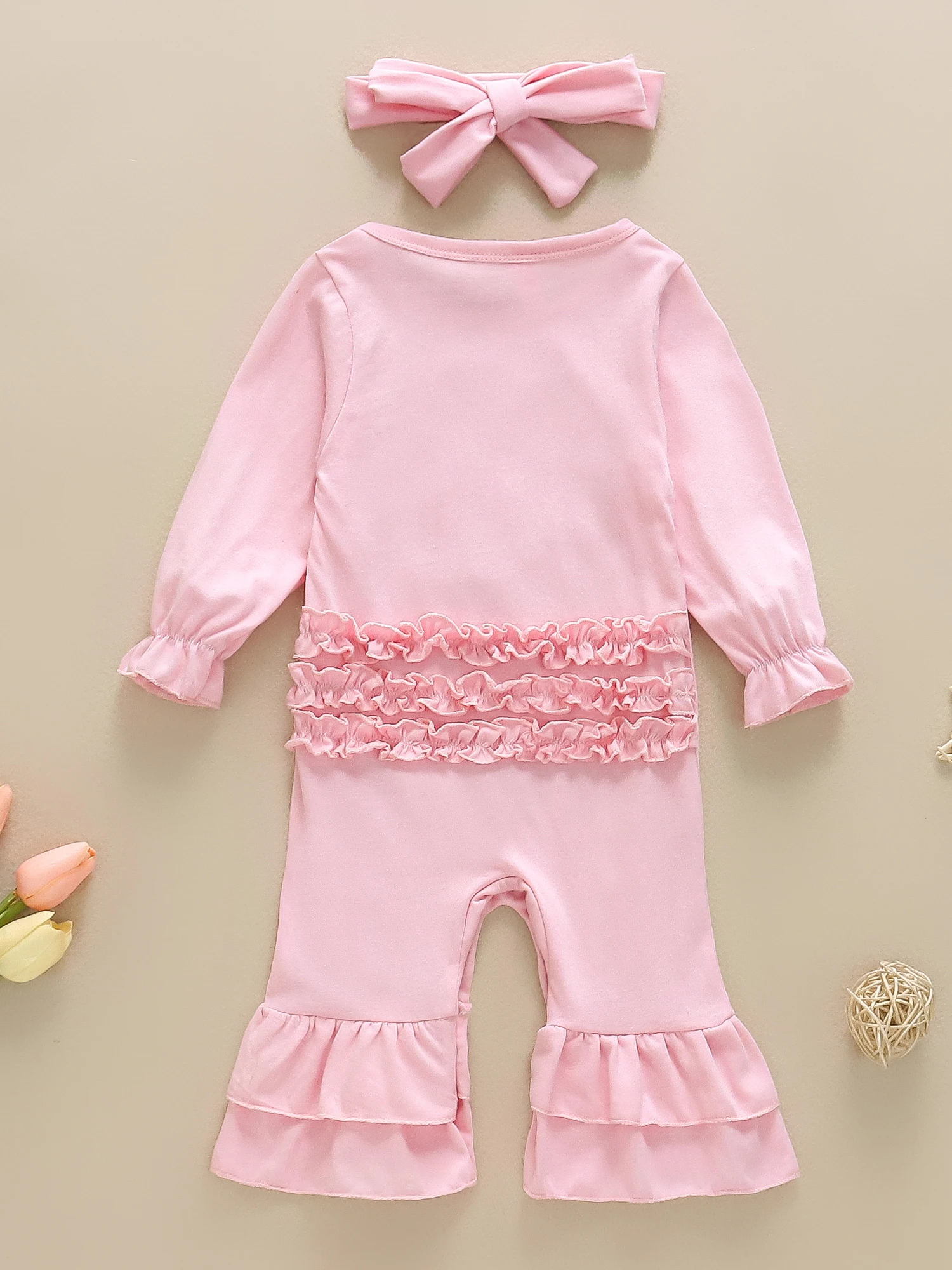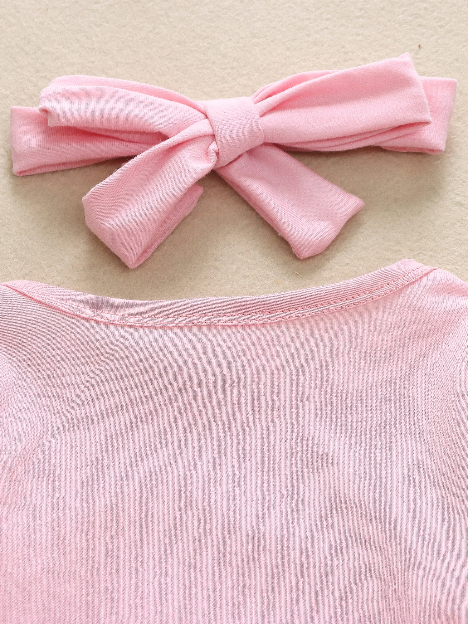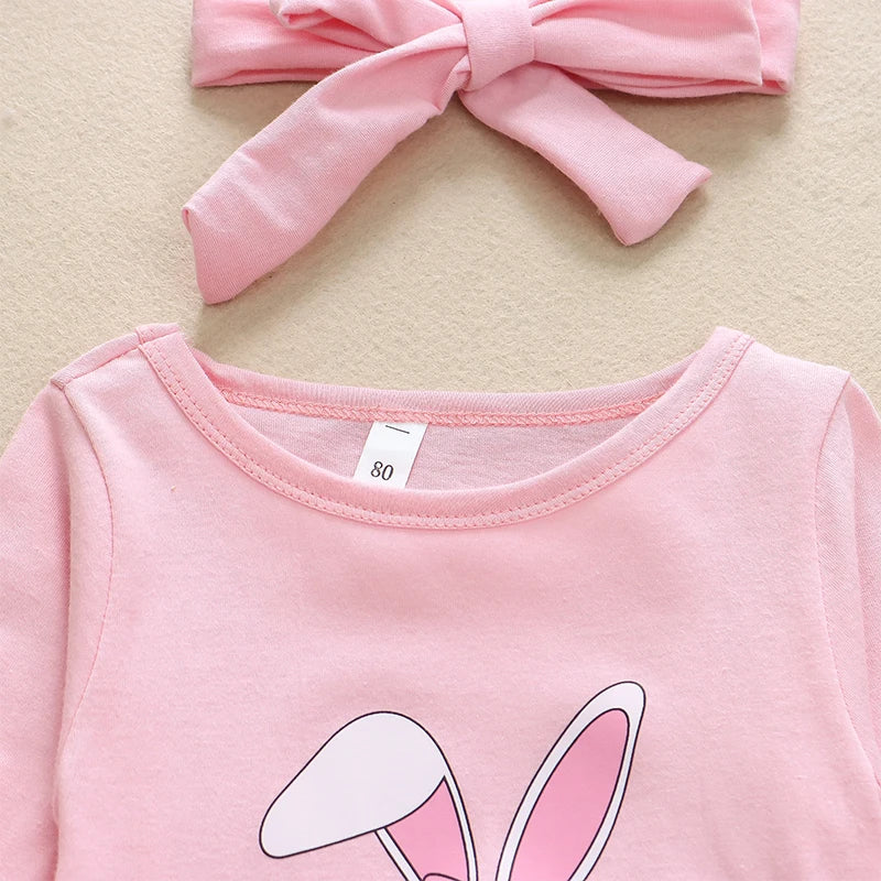 Baby Girl 2 Piece Set Long Sleeve Round Neck Bunny Ear Letter Print Romper + Solid Headband Infant Toddler Easter Outfits