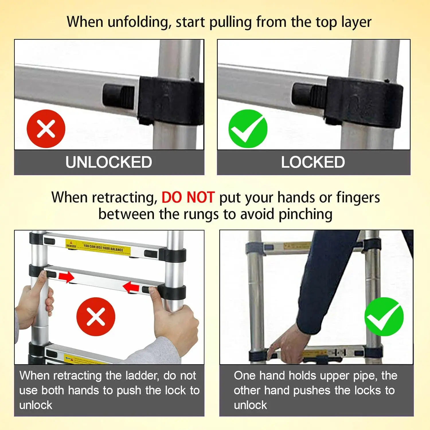 - When retracting the ladder, do not put your fingers on or between the rungs.