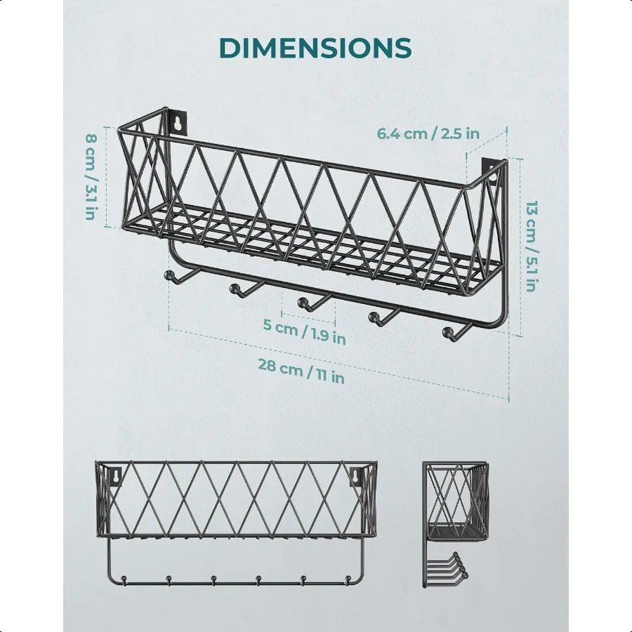 Entryway Mail Holder with Key Hooks 11.0" L×2.6" W×5.1" H Wall Mounted Matte Black Metal Wire Mesh Storage Basket with 5 Hooks