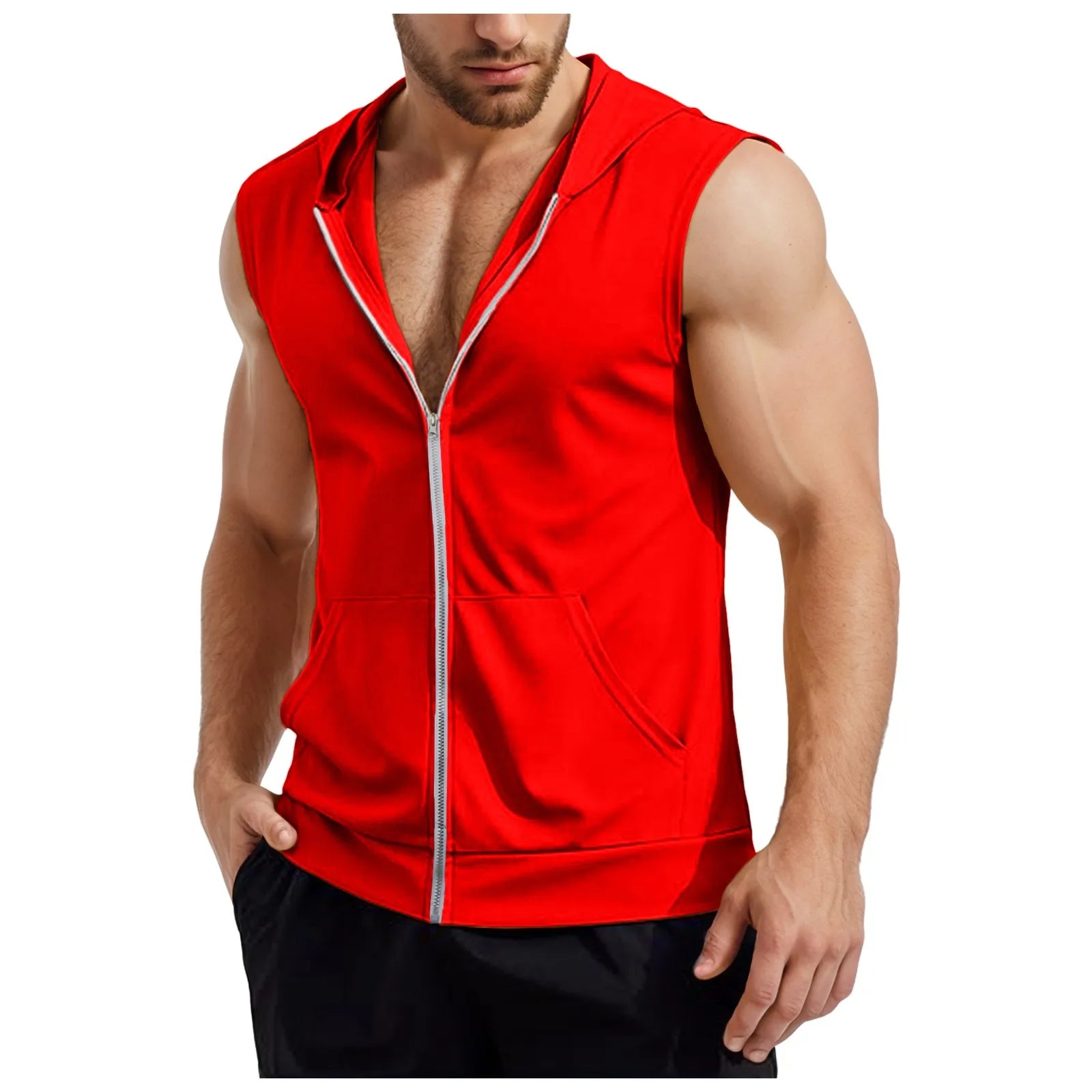 【Features】:Men workout hooded tank top featured with zip up, elastic hem and two side pockets is a must-have fashionable in . sleeveless hoodie create a fashion street style make you become comfortable about running and workout.