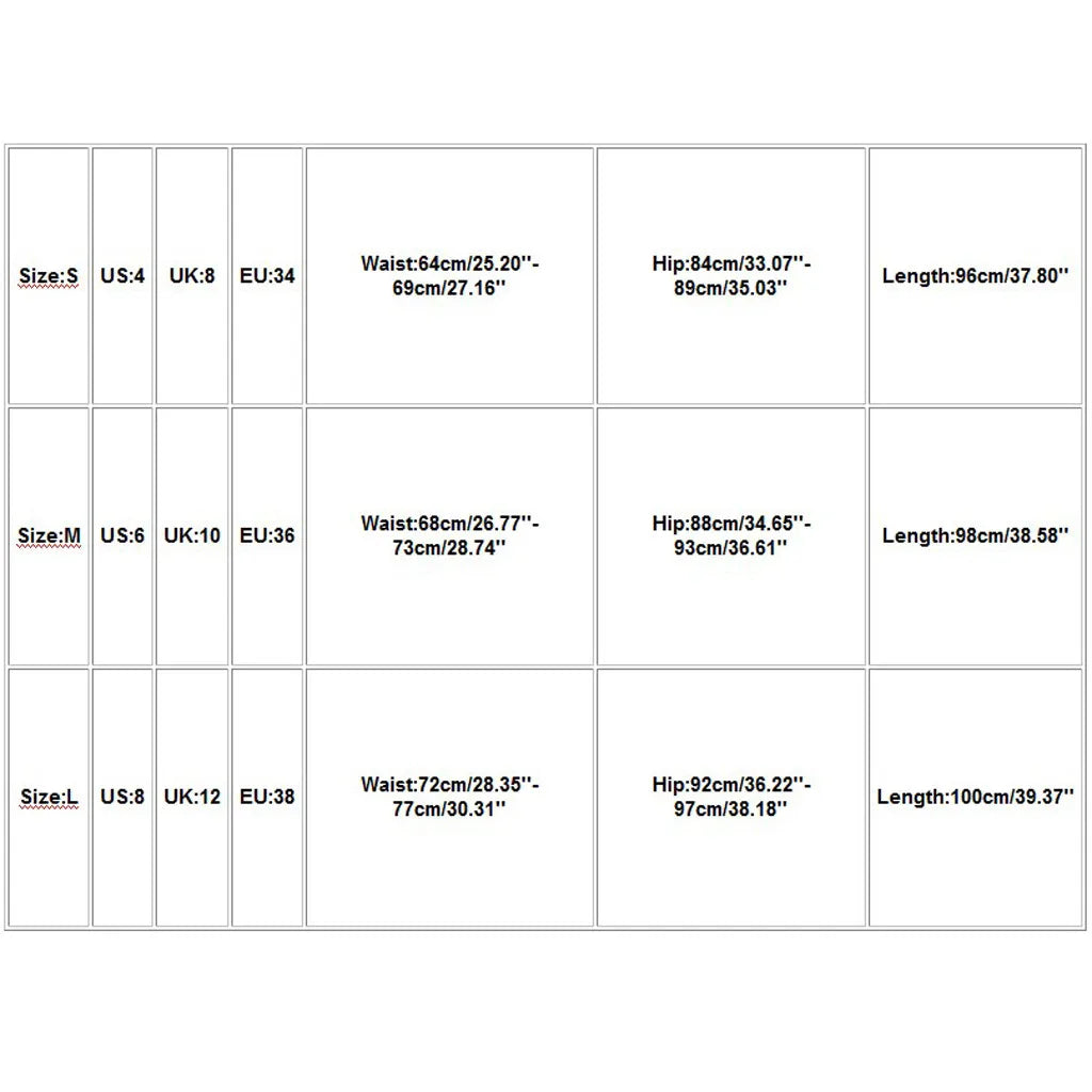 Size:L | US:8 | UK:12 | EU:38 | Waist:72cm/28.35''-77cm/30.31'' | Hip:92cm/36.22''-97cm/38.18'' | Length:100cm/39.37'' |