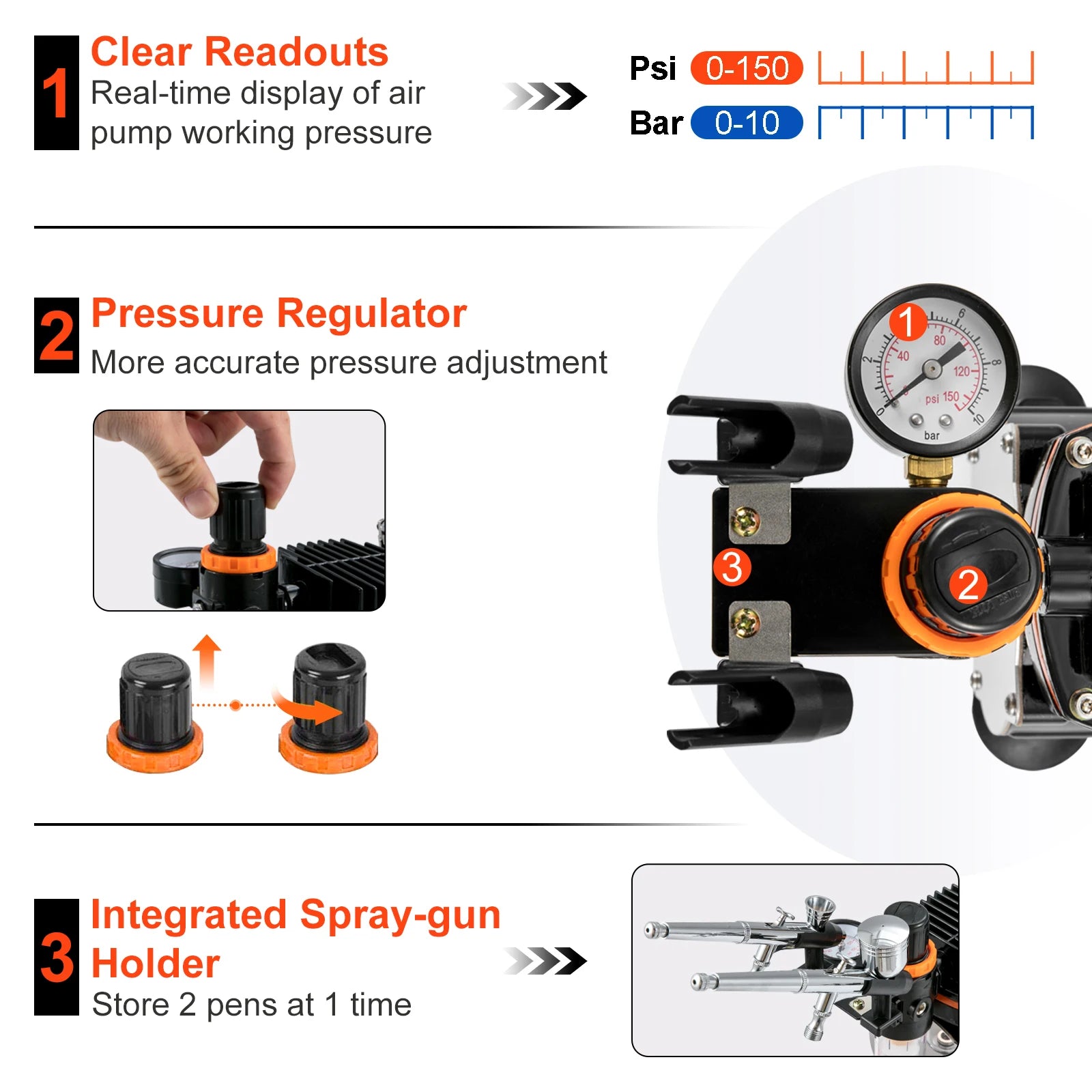 Professional Compressor: Get ready to create a new path of creativity. The high-efficiency air compressor can be inflated quickly and operate for long periods stably. Equipped with an adjustable pressure valve, you can conveniently check the real-time pressure. We also designed a convenient handle on the machine top for you to carry and move.
